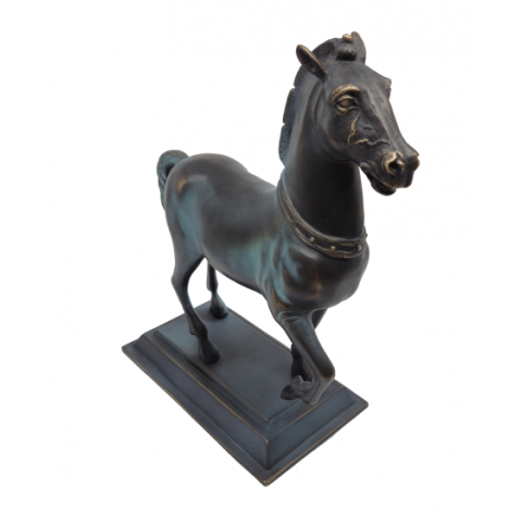 Hästen är av grönpatinerad brons och har måtten: 31 cm hög, 28 cm lång.