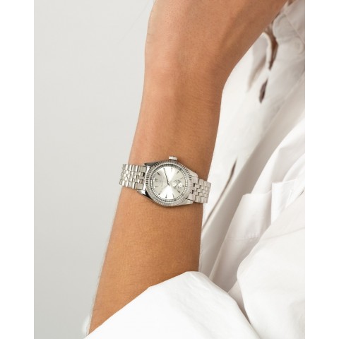 Boett: Rostfritt stålFärg på urtavla: Ljust silverUrtavla diameter: 28 mmUrverk: Miyota 1L40 Glas: SafirglasArmband: Kvalitetslänk i rostfritt stålBredd på armband: 14 mm bredVattentäthet: 10ATM vattentålighet